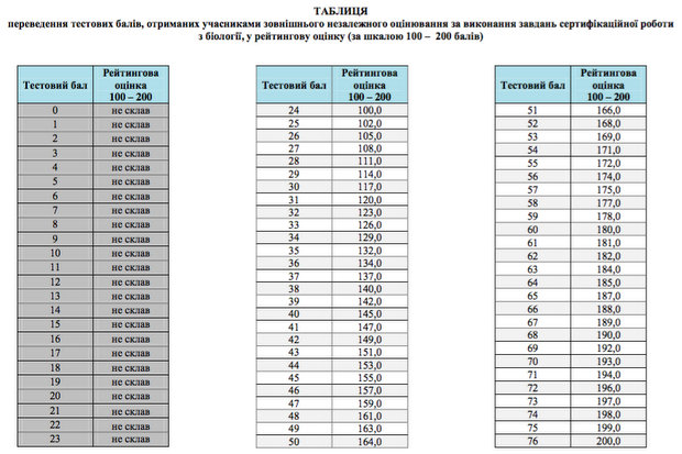 По результатам тестирования Украинским центром оценивания качества образования опубликована таблица перевода тестовых баллов, полученных участниками внешнего независимого оценивания за тест по биологии в 2016 году, в рейтинговую шкалу (100-200 баллов).