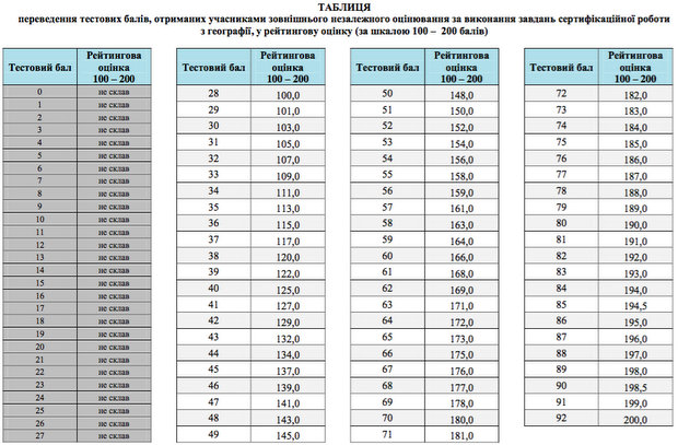 По результатам тестирования Украинским центром оценивания качества образования опубликована таблица перевода тестовых баллов, полученных участниками внешнего независимого оценивания за тест по географии в 2016 году, в рейтинговую шкалу (100-200 баллов).