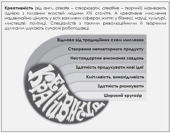 Отже, кожен, хто хоче досягти успіху в сучасному мінливому світі, має відмовитися від традиційних схем мислення, уміти творчо й оригінально розв’язувати завдання та продукувати нові нестандартні ідеї.