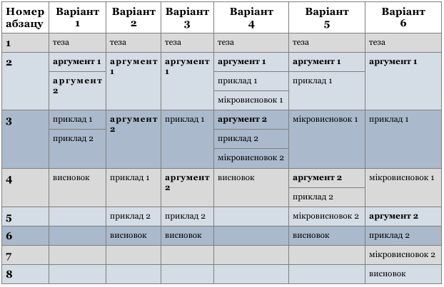 Відповідно до найчастотніших варіантів структурування змісту власного висловлення, аргументи завжди мають перебувати між тезою й висновком (див. таблицю).