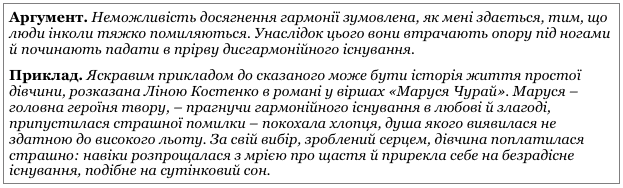 Зразок гармонійного співвідношення аргументу й прикладу у власному висловленні на тему «Чим зумовлено те, що інколи гармонія стає недосяжним для людини станом