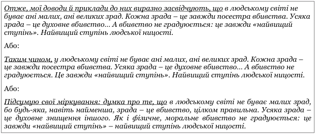 Наприклад, якщо автор створював власне висловлення не тему «Чи можна вибачити людині «маленьку» зраду, то з висновку має бути зрозумілим, яку відповідь він дав на запитання завдання, а отже, яку тезу сформулював і як її доводив. Наведені нижче варіанти висновків переконують у тому, що їхній автор упевнений у своїй висновковій позиції, а отже, очевидно, вона логічно випливає з усього тексту.