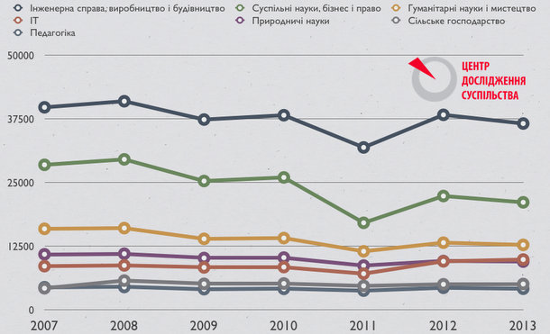 Тем не менее, сокращение мест на специальности общественных наук, бизнеса и права не означает автоматического сокращения количества выпускников этих специальностей. Это связано с сочетанием контрактного и бюджетного финансирования высшего образования. Значительная часть абитуриентов готова платить за обучение именно на этих направлениях, поскольку из-за стереотипов, которые бытуют в украинском обществе, считается, что именно такая квалификация будет давать высокий доход в будущем. Это подтверждает как существование программ в некоторых университетах, где обучаются преимущественно лишь на контрактной основе, так и данные ЮНЕСКО, согласно которым в 2009 году 45 % всех выпускников украинских ВУЗов были студентами именно общественно-политических направлений. Именно поэтому возможность университетов набирать студентов-контрактников сводит на нет попытку государства формировать и регулировать рынок труда за счет перераспределения мест государственного заказа.