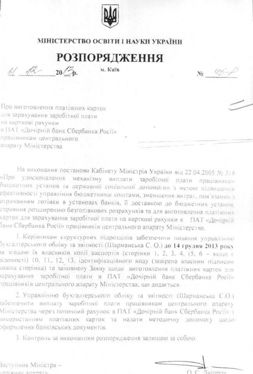 Работники центрального аппарата Министерства образования и науки теперь будут получать заработную плату через Сбербанк России. Соответствующее распоряжение подписано заместителем министра образования Алексеем Днипровым. Текст документа обнародован журналистами "Свідомо".