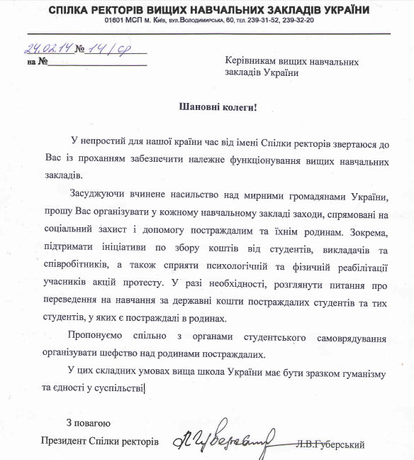 24 февраля в редакцию сайта Освіта.ua пришло письмо от президента Союза ректоров Украины и ректора КНУ Шевченко Леонида Губерского в котором он от имени союза обратился к ректорам высших учебных заведений Украины и призвал обеспечить нормальную работу высшей школы.