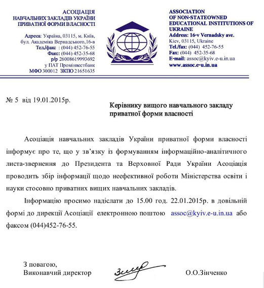 В частности, в письме сообщается, что ассоциация проводит сбор информации относительно неэффективной работы Министерства образования и науки в отношении частных высших учебных заведений. В связи с чем в ассоциации просят ректоров частных вузов предоставить соответствующую информацию ее дирекции.