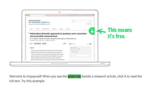 Цей сервіс можна безкоштовно додати в Google Chrome. Він дає змогу правомірно отримати повний текст наукової статті. Під час перегляду Unpaywall автоматично шукає примірник серед 20 мільйонів безкоштовних повнотекстових PDF-файлів. Якщо його знайдено, потрібно натиснути зелену вкладку, щоб прочитати статтю.