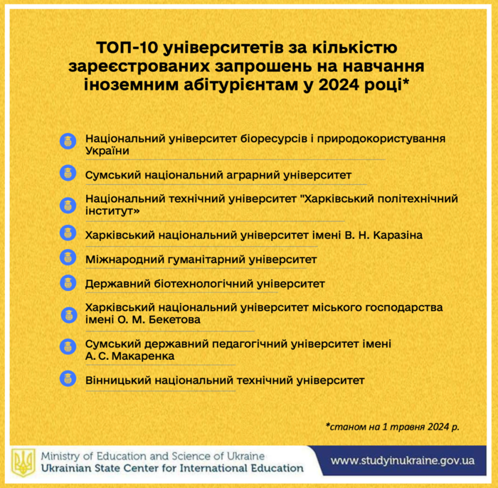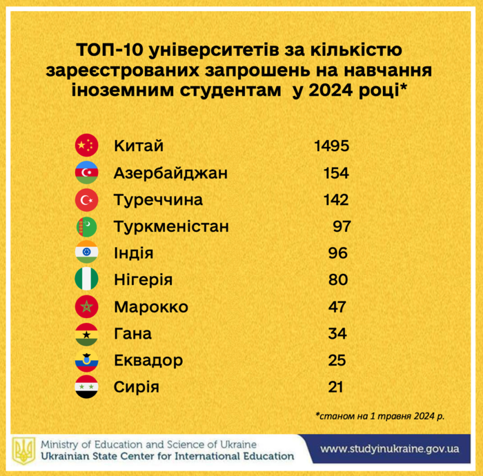 Наразі найбільш популярною українська освіта (за кількістю запрошених іноземців) є в Китаї, а загалом виявили інтерес до навчання в Україні абітурієнти з 65 країн світу.