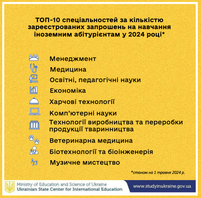 Також іноземних абітурієнтів цікавлять педагогіка, культура і мистецтво, харчові технології, компʼютерна інженерія, електротехніка тощо.