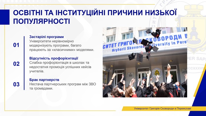 Відсутність активної профорієнтації в школах, слабка промоція успішних кейсів учителів і нестача партнерських програм між закладами вищої освіти та громадами створюють додатковий розрив між очікуваннями абітурієнтів та реальністю педагогічної освіти.