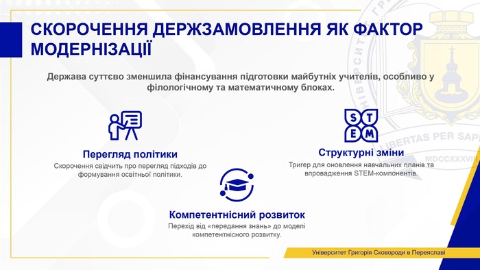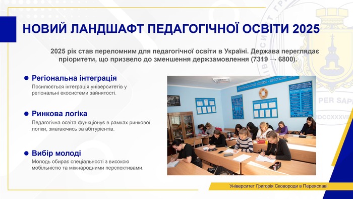 2025 год стал переломным для педагогического образования в Украине. Государство пересмотрело приоритеты, что привело к уменьшению государственного заказа с 7319 до 6800 мест. В то же время университеты обнаружили сопротивление и адаптацию, усиливая интеграцию в региональные экосистемы занятости.