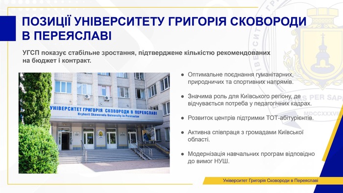 Університет Григорія Сковороди в Переяславі показує стабільне зростання, підтверджене кількістю рекомендованих на бюджет і контракт. Університет оптимально поєднує гуманітарні, природничі та спортивні напрями, а його роль особливо значуща для столичного регіону, де відчувається потреба у педагогічних кадрах.