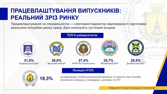 Працевлаштування за спеціальністю – ключовий індикатор відповідності підготовки реальним потребам ринку праці. Наявні дані показують суттєвий розрив: топ-5 університетів за працевлаштуванням включають Криворізький державний педагогічний університет (31,5%), Мукачівський державний університет (30,0%), Південноукраїнський національний педагогічний університет ім. Ушинського (27,4%), Вінницький державний педагогічний університет (25,7%) та Донбаський державний педагогічний університет (25,5%).