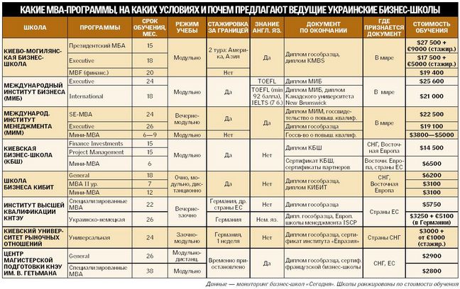 ГДЕ УЧИТЬСЯ. Учитывая тот факт, что MBA - это немалые инвестиции не только денег, но и не менее ценного времени, надо взвешенно подойти к выбору бизнес-школы и программы обучения. Во-первых, определиться, будет это украинская школа или зарубежная. Последняя вроде бы престижнее. Однако все, чему вас там научат, не будет иметь ни малейшей привязки к украинским особенностям ведения бизнеса. Поэтому выбирать стоит, исходя из ориентации компании на внутренний или зарубежный рынок. Впрочем, некоторые украинские школы практикуют комбинированный вариант: основное время студенты учатся здесь, а потом едут на месяц в Англию, США или другую страну, где проходят стажировку, сдают экзамены и получают второй диплом иностранной бизнес-школы. Но стоимость таких программ зачастую оказывается такой же, как украинских, только в долларовом эквиваленте! К тому же потребуется отличное знание английского.
