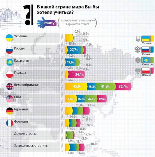 Ответы студентов Украины, России, Казахстана и Польши на вопрос "В какой стране мира вы хотели бы учиться?"