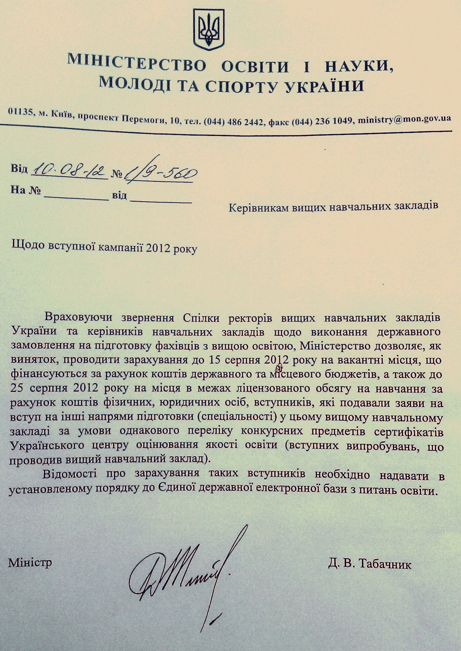 Кроме этого, до 25 августа 2012 года было разрешено приносить оригиналы документов на контрактную форму обучения не только на те направления подготовки, на которые абитуриент подал документы до 31 июля, а и на другие. Однако это можно сделать только в рамках одного учебного заведения и на направления с одинаковыми конкурсными предметами.