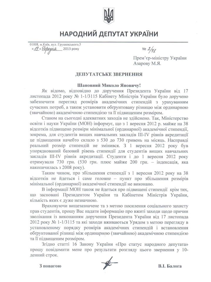 "Учитывая вышеизложенное и с целью усиления социальной защиты прав студентов, прошу Вас предоставить информацию о принятых мерах, касающихся причин промедления с выполнением поручения Президента Украины от 17 ноября 2012 № 1-1/3115 и мерах, которые принимаются правительством с целью пересмотра в установленном порядке размеров академических стипендий и установления обоснованной разницы между ординарной (обычной) академической стипендией и ее повышенным размером", - говорится в обращении народного депутата Виктора Балоги к премьеру.