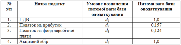 Розрахунки питомої ваги кожної бази оподаткування фірми зведено у таблицю 1.