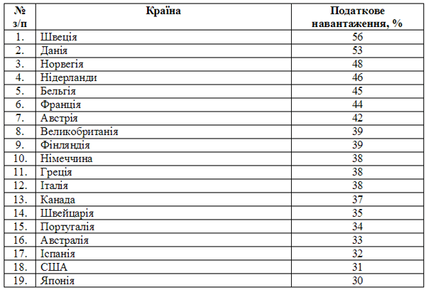 Податкове навантаження на середньостатистичну фірму України становить 38%. Порівняємо це податкове навантаження з навантаженням податків, зборів і обов’язкових платежів передових країн світу [15].