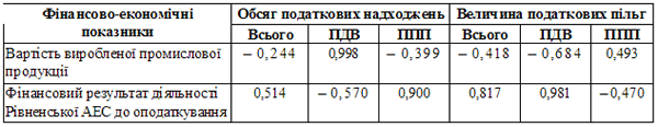 Таблиця 3. Взаємозв’язок фінансово-економічних і податкових показників діяльності Рівненської АЕС у 1998–2001 рр. (за величиною коефіцієнта кореляції).