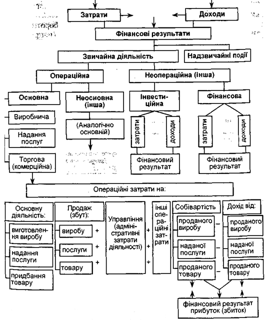 Фінансовий аспект побудови бухгалтерського обліку вимагає аналогічної структуризації побудови бухгалтерського обліку затрат, доходів та фінансових результатів. Як видно із вищенаведеного рисунка, діяльність може бути трьох видів: