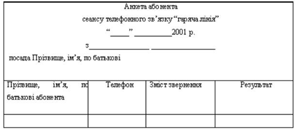 • відповідальний за проведення "гарячої лінії" починає роботу на лінії за півгодини до оголошеного часу, при бажанні абонента може заповнювати анкету із запевненням довести зміст звернення до керівника;