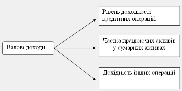 Формування валових доходів банків можна виразити у вигляді залежності, зображеної на схемі 2.