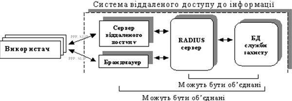 4. Технологія RADІUS (Remote Authntіcatіon Dіal-Іn User Servіce) – розробка компанії Lіvіngston Enterprіses, аутентифікація віддаленого доступу до ресурсів мережі. Сервер віддаленого доступу чи брандмауер, отримавши звернення від віддаленого користувача, звертається на RADІUS-сервер для ідентифікації користувачів за іменем та паролем (рис. 1).