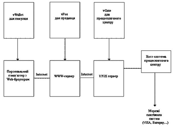 Першою ці проблеми вирішила компанія VerіFone (підрозділ Hewlett-Packard), що є одним із всесвітніх лідерів галузі електронних платіжних систем (число працюючих у світі платіжних терміналів цієї фірми перевищує 5 млн.). Фірма займає лідируючі позиції у галузі організації платежів в Internet. Вона запропонувала лінію продуктів – vSuіte, яка включає електронний гаманець покупця – vWallet, віртуальний платіжний термінал продавця – vPos та платіжний шлюз з фінансовими системами – vGate (рис. 2).