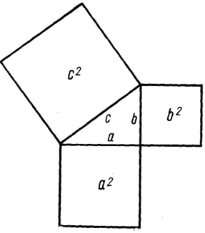Прямокутний трикутник піфагорійці вважали найкращою і найдосконалішою фігурою. Одним із способів побудови такого трикутника був поділ правильного трикутника пополам. Прямокутні трикутники, довжини сторін яких — цілі числа, утворюють окремий клас, для якого справджується теорема, названа ім'ям Піфагора, хоч вона була відома задовго до нього вавілонянам. За теоремою Піфагора сума площ квадратів, побудованих на катетах прямокутного трикутника, дорівнює площі квадрата, побудованого на гіпотенузі (дивись малюнок).