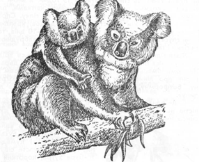 Є ще одна деревна тварина, яка повільністю та інертністю нагадує лінивця: це австралійський коала - дуже симпатичний сумчастий звірок, схожий на плюшевого ведмедика. У нього велика голова з круглими вухами, невеликі очиці і кумедний ніс, густе й пухнасте сірувато-буре хутро, короткий тулуб з рудиментарним хвостиком. Завдяки гострим і сильним кігтям він повільно лазить по евкаліптових деревах, листям яких живиться.