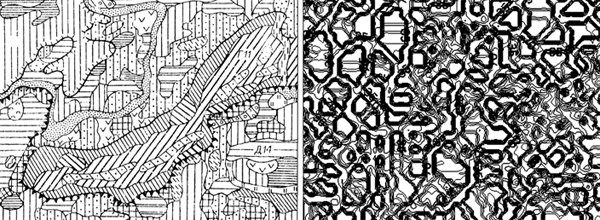 Рис. 1. Фрагмент карти частини КАТЕК (зліва) (за Семеновим Ю. М., 1991), побудованої способом найближчого сусіда та ухилів поверхні відстаней між центрами контурів (справа).