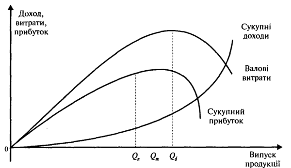 Максимум прибутку підприємство одержуватиме якщо обсяг продажу буде дорівнювати значенню у точці Qn, коли граничний доход підприємства зрівняється з граничними витратами. Але валовий доход ще певний час продовжує зростати, доки обсяг продажу не досягне точки Qd. Кожна одиниця продукції між точками Qn і Qd збільшує сукупний доход від продажу, але зменшує сукупний прибуток, оскільки граничні витрати вже перевищують граничний доход. При початковому падінні ціни і подальшому зростанні виробництва валовий доход також починає зменшуватися.