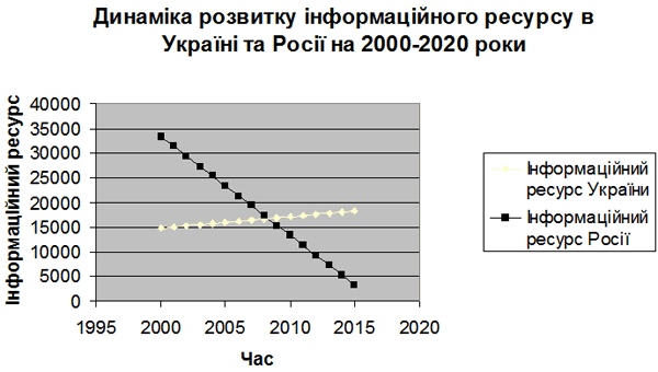 На графіку бачимо дуже цікаву ситуацію. Інформаційний ресурс України досить повільно зростатиме, у той час як російський зменшуватиметься. Справді, щороку кількість російськомовних видань в Україні зменшується, а отже і падає вплив Росії на наш інформаційний простір. За умов вкрай повільного зростання кількості власних друкованих ЗМІ, від даного аспекту побудови інформаційного суспільства Росія не має розраховувати на суттєву допомогу.