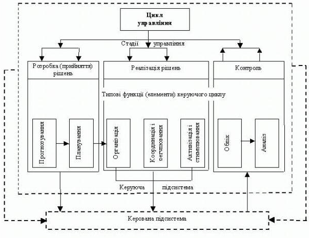 Взаємозв'язок загальних функцій управління і їх взаємодія у процесі здійснення управлінського циклу може бути зображена у вигляді схеми, наведеної на рис. 1.