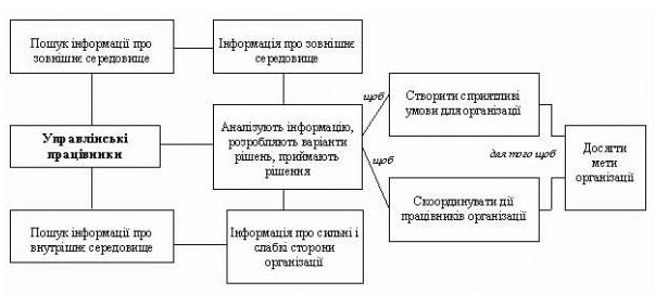 При виконанні кожної із функцій менеджери опрацьовують інформацію, яка необхідна для обґрунтування і прийняття управлінських рішень. Інформація надходить завдяки налагодженим комунікаційним процесам. В загальному зміст процесу управління організацією можна зобразити схемою, наведеною на рис. 3.