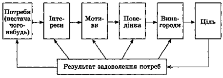 Потреби поділяють на первинні (фізіологічні) і вторинні (психологічні); винагороди — на внутрішні (отримують у процесі роботи, від змісту трудового процесу, відчуття самоповаги тощо) і зовнішні (зумовлені заробітною платою, просуванням за службовою ієрархією, кабінетом, службовим авто, додатковою відпусткою тощо). Узагальнену модель мотивації через потреби можна зобразити графічно (рис. 2).