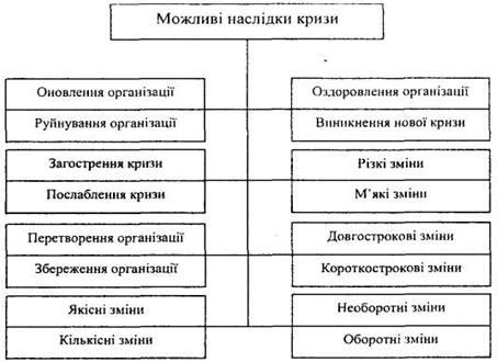 У розумінні кризи велике значення мають не тільки причини, але й можливі наслідки кризи: імовірне оновлення організації або її руйнування, оздоровлення або виникнення нової кризи (рис. 2) [7, с. 19].