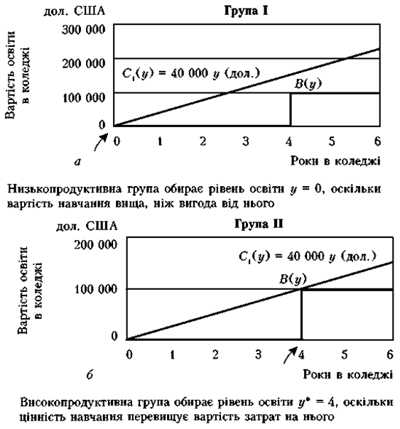 Важливим є те, що витрати на освіту вищі у низькопродуктивної групи, ніж у високопродуктивної. Це може відбуватися з двох причин. По-перше, робітники з низькою продуктивністю праці можуть бути просто менш старанними. По-друге, вони, можливо, досягають менших успіхів у обраних ними програмах навчання. Зокрема, припустимо, що для групи І витрати на отримання освітнього рівня складають: