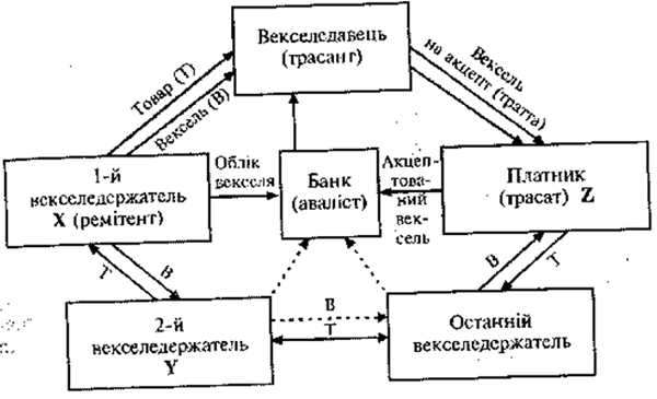 Схема обігу переказного векселя виглядає так (рис. 19): фірма X постачає товар фірмі Y, а та, у свою чергу, свій товар - фірмі Z. До здійснення розрахунків фірма Y виявляється одночасно і дебітором (перед X), і кредитором (перед Z). Фірма Y може пустити в обіг переказний вексель, де пропонує фірмі Z у певний термін і в певному місці виплатити певну суму X. Фірма Y відсилає тратту фірмі Z для акцепту і акцептовану тратту (вексель) передає фірмі X. Фірма X, реалізуючи вексель, отримує платіж. Ланцюжок передач векселя може бути довшим і виявитися замкнутим.