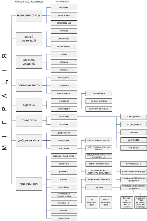Більшість з наведених класифікацій відображає лише певний аспект міграції (причини, тривалість, правовий статус мігрантів тощо) або застосовує різні критерії для однієї класифікації. Тому вважаємо за доцільне запропонувати зведену схему класифікації міграцій, здійснену за певними критеріями (таблиця 1). Вона відповідає полісемантичному характеру міграції як соціального феномена і дозволяє здійснити перехід від теоретичного підґрунтя до реалізації його положень у конкретно-соціологічних дослідженнях шляхом відповідної операціоналізації запропонованих понять.