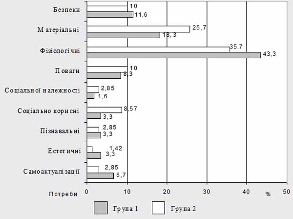 У контексті поставленої задачі доволі інформативним виявилося дослідження потребової сфери засуджених. Щодо респондентів групи 1, то 73,2% з них вказали першочерговими для себе фізіологічні, утилітарні потреби та потреби безпеки, причому 43,3% опитаних найважливішим вважають задоволення саме фізіологічних потреб. У 15,7% групи 1 відмічена збоченість потребової сфери – при опитуванні вони висловили переконання, що у житті людини взагалі цілком достатньо задовольняти лише фізіологічні потреби.